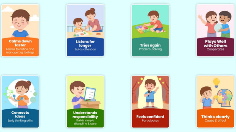 Short stories, simple games, and hands-on activities. When children can manage emotions, focus, and try again, they listen better, learn faster, and feel safer.